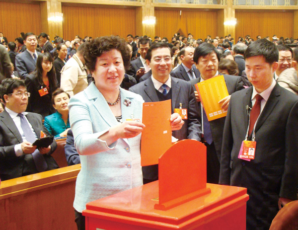 李雪芹在十二届全国人大一次会议上投下神圣的一票